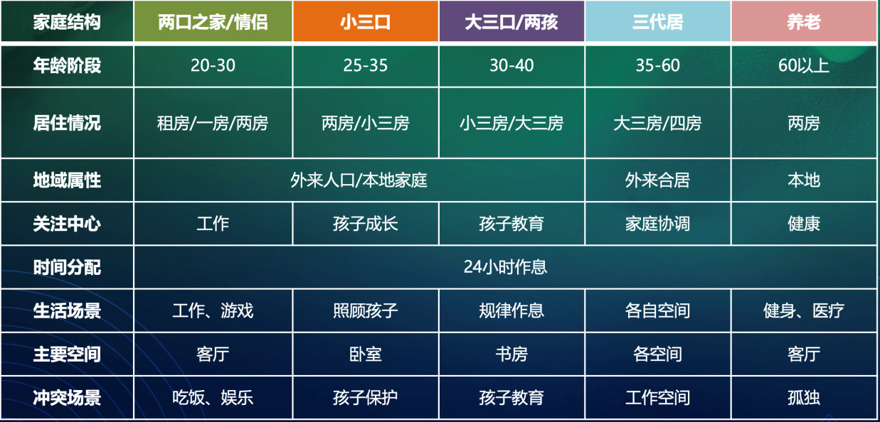 本次研究涵蓋了五類主要的家庭結構,我們將分為兩口之家、小三口、大三口/兩孩、三代居和養(yǎng)老客戶類型。對比關注中心、時間分配、生活場景、沖突場景等方面進行全方位調查。