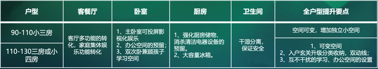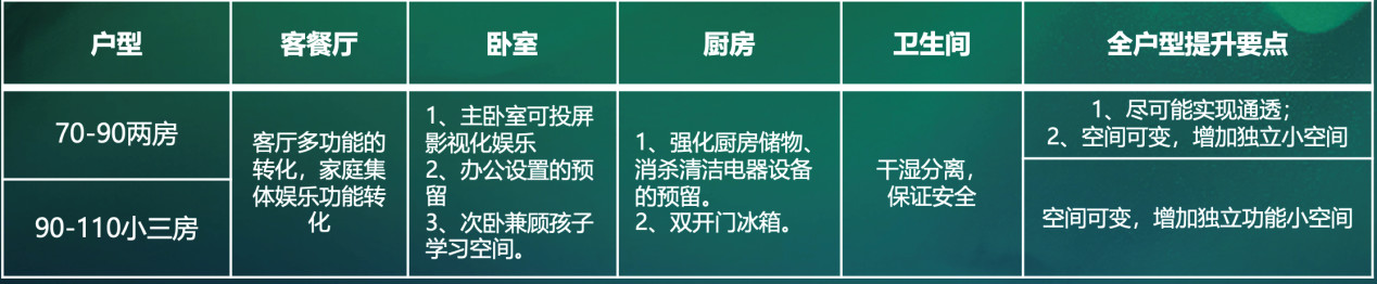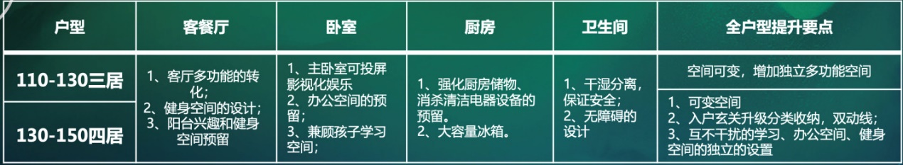 兩代居三口之家:有更強烈的換房或功能升級的需求;提升要點:客廳多功能轉化、可變多功能空間。