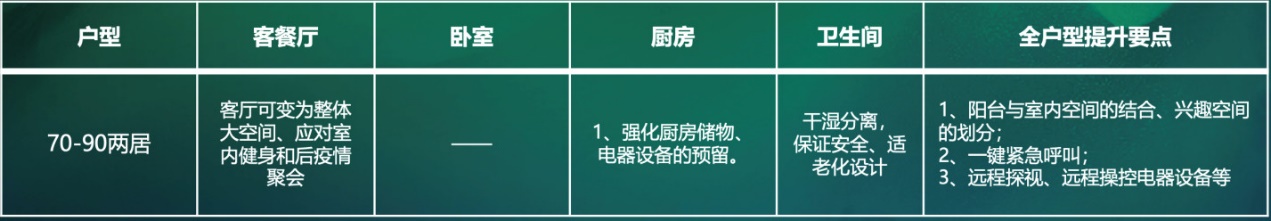 養(yǎng)老:核心痛點為無人陪伴的孤獨,和室內健身空間;提升要點:遠程探視一鍵操控,適老化設計。