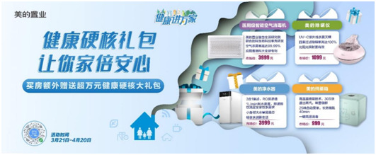 3月21-4月20日,凡購房美的置業(yè)各地樓盤房產(chǎn)的客戶,可額外獲贈超萬元的健康硬核大禮包,內(nèi)含美的置業(yè)聯(lián)合研發(fā)的醫(yī)用級智能空氣消毒機,及美的凈水器、除螨儀、純蒸箱,覆蓋了家庭空氣消毒、水凈化、生活起居健康、飲食健康等。