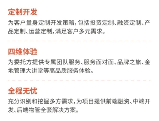 金地管理針對不同類型的客戶需求,提供量身定制開發(fā)策略,包括投資定制、融資定制、產(chǎn)品定制、運營定制,為客戶打造定制級、多維度、全過程的服務(wù)。
