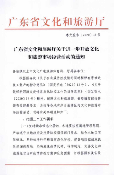 今天(5月19日)是中國旅游日,這是新冠肺炎疫情發(fā)生以來文旅行業(yè)迎來的第一個重大行業(yè)節(jié)日。隨著廣東省文化和旅游廳印發(fā)進(jìn)一步開發(fā)文化和旅游市場經(jīng)營活動的通知,提出在全面落實防控措施前提下,采取預(yù)約、限流等方式,有序恢復(fù)本轄區(qū)內(nèi)文化經(jīng)營場所和旅行社及在線旅游企業(yè)省內(nèi)旅游經(jīng)營活動。