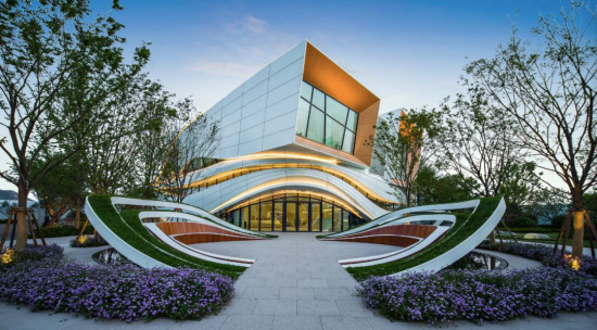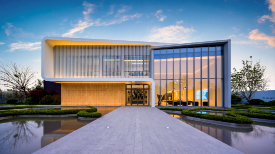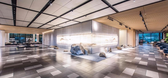 廣州實地薔薇國際整個銷售中心極具東方禪意,枯山水庭院滿布于此,以石塊象征山、以白沙象征湖海、以線條表示水紋,看似獨成一景,卻又與室外之景相互融合,實現(xiàn)了“建筑+景”到“景+建筑”的視角轉變。