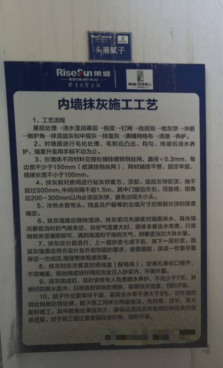 內(nèi)墻抹灰施工工藝需要13道工序,比業(yè)內(nèi)通用做法復(fù)雜,流程上也多加了兩三道,據(jù)了解,有的企業(yè)為了簡化流程已經(jīng)取消拉毛工藝。