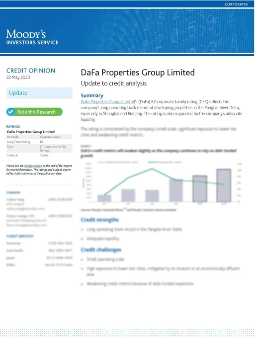 大發(fā)地產(chǎn)2019年增長明顯,合約銷售及收入分別約為人民幣210億元及人民幣74億元,同比上升67.8%及24.4%。鑒于大發(fā)地產(chǎn)土儲主要位于購房需求強勁的長三角地區(qū),穆迪預(yù)計集團2020年及2021年合約銷售將可保持穩(wěn)定增長。2020年1-4月集團合約銷售約為人民幣48億元,已完成全年合約銷售目標約20%。