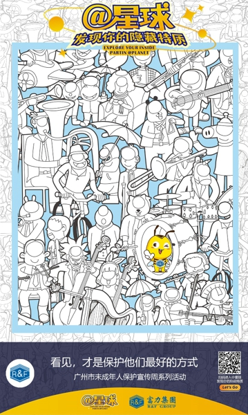 在這個(gè)發(fā)現(xiàn)自我隱藏特質(zhì)的互動(dòng)H5“@星球”中,玩家通過(guò)選擇喜歡的圖案、擦出色彩,就可以發(fā)現(xiàn)自己的一種隱藏特質(zhì)。“@星球中一個(gè)個(gè)鮮活的卡通形象展示不同的人群,每個(gè)人都可以在@星球中找到自己‘合眼緣’的一個(gè)甚至多個(gè)角色”。大家還可以在畫(huà)作中找到屬于富力集團(tuán)的富力人“富小蜂”,為它也涂上獨(dú)特的色彩吧。