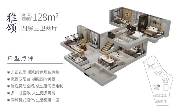 建筑面積約128㎡四房兩廳三衛(wèi),配備雙陽臺設(shè)計,采光充足和通風效果佳,擁小區(qū)奢闊園林視野。