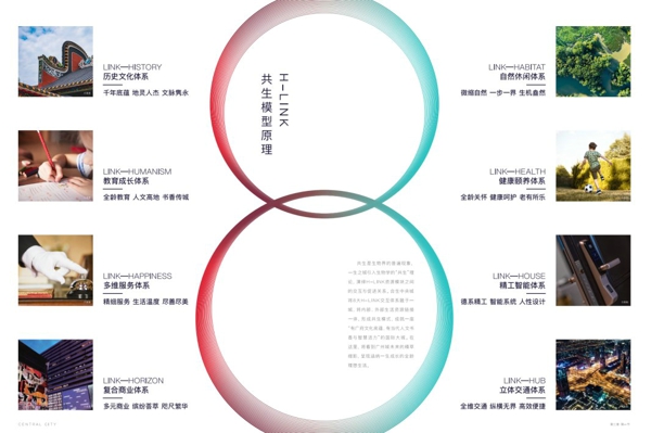 并從人本視角出發(fā),構(gòu)建了以家為軸心的生活場(chǎng)、以城市為核心的工作場(chǎng)、以人文為重心的精神場(chǎng)三大造城原則,打造8大H-LINK交互體系,涵蓋LINK-HISTORY歷史文化體系、LINK-HUMANISM教育成長(zhǎng)體系、LINK-HORIZON復(fù)合商業(yè)體系、LINK-HUB立體交通體系、LINK-HEALTH健康頤養(yǎng)體系、LINK-HABITAT自然休閑體系、LINK-HAPPINESS多維服務(wù)體系、LINK- HOUSE精工智能體系,將內(nèi)部、外部生活資源鏈接一體,形成共生模式。