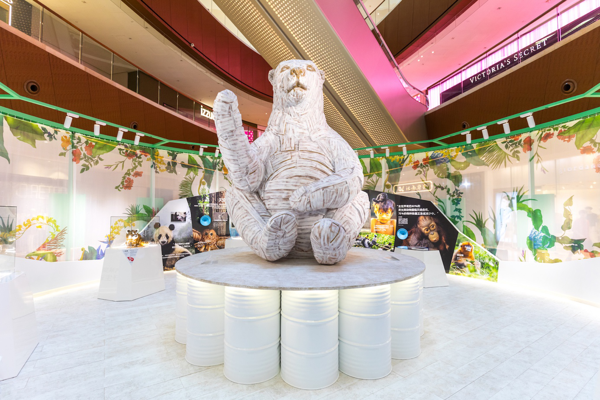 展覽位處廣州太古匯商場M層,共設兩個展區(qū)。其中,中心展區(qū)呈環(huán)形布局,由綠植和花卉圖案環(huán)繞,仿如空降鬧市的絢爛叢林世界。展區(qū)內(nèi)陳列著五座栩栩如生的動物雕塑,分別以北極熊、金絲猴、考拉、鯨頭鶴、小熊貓這幾種易?;驗l危動物為形象。這些獨具匠心的作品均出自加拿大著名藝術家Laurence Vallières女士之手,她擅長使用硬紙殼等可再生物料重現(xiàn)動物的神情動態(tài),為平凡物件賦予不凡的二次生命,以藝術創(chuàng)作為媒介,表達對地球生態(tài)的深切關注思考。