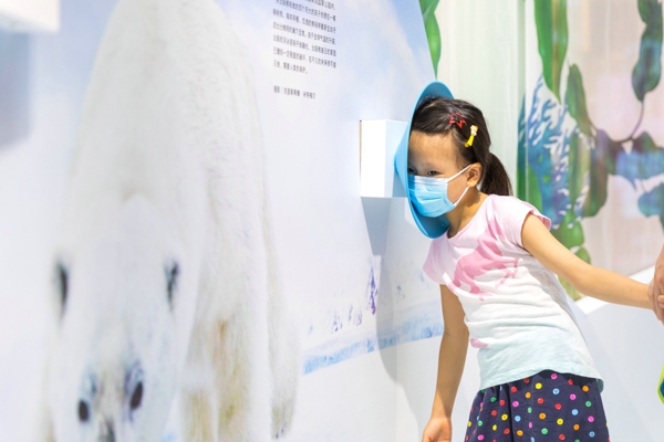 移步另一側展區(qū),引人注目的藝術裝置“蹺蹺板”為觀展增添了別樣驚喜。觀眾可通過特別設置的互動,使分別置于蹺蹺板兩端的“北極熊”和“人類”改變相對高度,寓意只要人類作出努力,就能幫助身處劣勢的珍稀動物轉危為機。富有想象力的互動吸引了不少市民親身參與,在方寸之地,探尋人與自然和諧共處的博大之道。