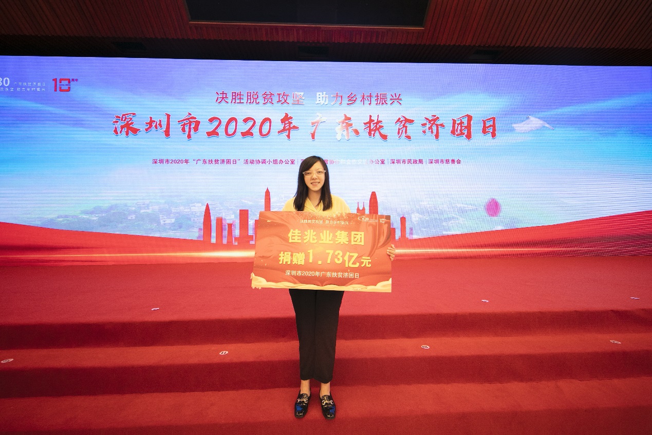 2020年是脫貧攻堅(jiān)決戰(zhàn)決勝之年,為全面落實(shí)黨中央、國(guó)務(wù)院和省委、省政府的決策部署,6月30日,2020年“廣東省扶貧濟(jì)困日活動(dòng)”舉行,佳兆業(yè)集團(tuán)再度捐款1.73億元人民幣,用于“決勝脫貧攻堅(jiān) 助力鄉(xiāng)村振興”。其中在廣東省活動(dòng)現(xiàn)場(chǎng)捐贈(zèng)1.33億,深圳市活動(dòng)現(xiàn)場(chǎng)捐贈(zèng)4000萬(wàn)。2017年至今,佳兆業(yè)已累計(jì)捐贈(zèng)5.13億元人民幣,全面用于廣東省脫貧攻堅(jiān)戰(zhàn),是近四年來(lái)累積捐贈(zèng)金額最大的廣東企業(yè)之一。