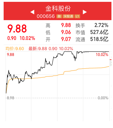 在第三方統(tǒng)計(jì)機(jī)構(gòu)公布半年銷(xiāo)售業(yè)績(jī)后,7月地產(chǎn)股呈現(xiàn)集體走強(qiáng),掀起下半年第一波上漲熱潮。其中金科股份(000656)連續(xù)兩日漲停收盤(pán),2日收盤(pán)價(jià)公司股價(jià)創(chuàng)歷史新高,達(dá)到9.88元,總市值首度突破500億元,收盤(pán)市值達(dá)到528億元。