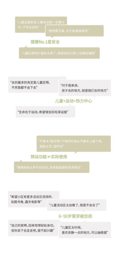 從用戶視角出發(fā),為了發(fā)現(xiàn)真正的健康需求,美的置業(yè)對(duì)20戶不同構(gòu)成的家庭進(jìn)行了深度采訪,了解居民在社區(qū)當(dāng)中的生活特征、使用習(xí)慣以及健康觀,并對(duì)社區(qū)進(jìn)行了復(fù)盤。