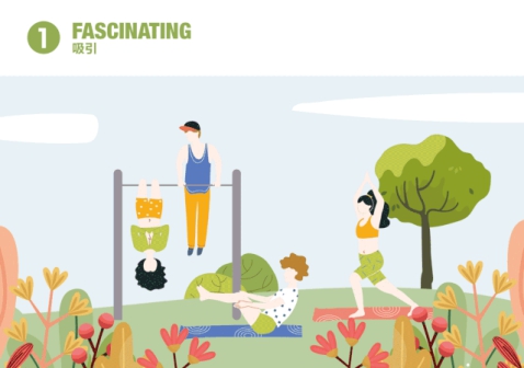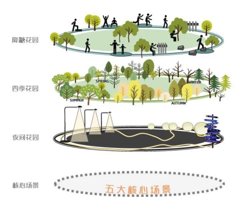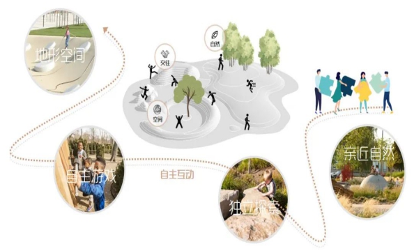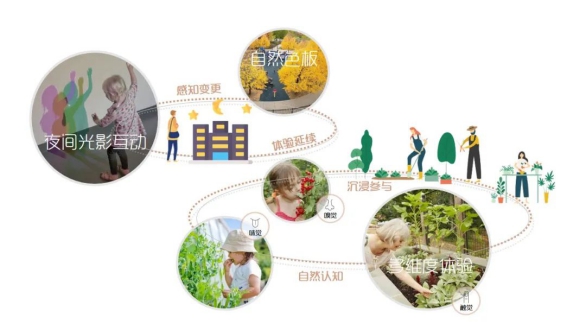 核心場(chǎng)景屬于實(shí)體場(chǎng)景,分別強(qiáng)調(diào)“運(yùn)動(dòng)社交””玩轉(zhuǎn)地形““趣味挑戰(zhàn)”“自然聲音”和“感知參與”。承載理論當(dāng)中“接地”、“樹木氣功”、“園藝”與“冥想”等療法。加載場(chǎng)景以“健康療愈”“季節(jié)感知”和“逐光之旅”三大主題作為核心,賦予五大核心場(chǎng)景更多維更立體的感知體驗(yàn)。