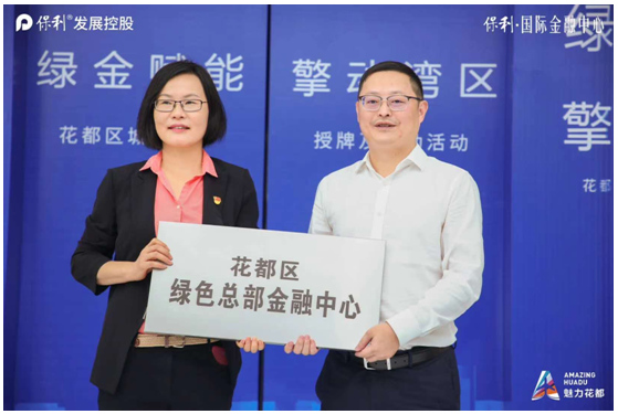 花都區(qū)區(qū)委副書記、區(qū)長邢翔(左)代表花都區(qū)人民政府授予保利國際金融中心“花都區(qū)綠色總部金融中心”稱號