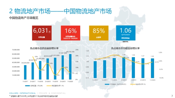 中國(guó)物流地產(chǎn)市場(chǎng)方面,高力國(guó)際物流倉儲(chǔ)租金地圖所包含的33個(gè)熱點(diǎn)城市,截止2020年上半年總供應(yīng)量超過6,000萬平方米,每年保持穩(wěn)定增長(zhǎng)。平均凈有效租金1.06元/平方米/天,租金同比略有下滑,主要由于核心城市土地供應(yīng)愈發(fā)收緊,新增供應(yīng)主要位于非核心區(qū)域從而租金報(bào)價(jià)較低。全國(guó)總出租率85%,長(zhǎng)期處于高位水平,顯示物流地產(chǎn)板塊穩(wěn)健的需求。
