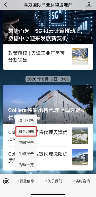 高力國(guó)際對(duì)租金地圖2.0版進(jìn)行了發(fā)布。地圖一共有三個(gè)層級(jí)——全國(guó)、區(qū)域和城市,每個(gè)頁面都有供應(yīng)量、出租率和凈有效租金等數(shù)據(jù)和統(tǒng)計(jì)。相比于之前的版本,租金地圖2.0版有以下幾個(gè)特點(diǎn):首先,線上租金地圖是你身邊的數(shù)據(jù)庫,信息的獲取更方便;其次,豎版設(shè)計(jì)更適合手機(jī)端閱讀;再次,頁面顯示統(tǒng)計(jì)結(jié)果圖表,不用另行計(jì)算;最重要的是,增加城市對(duì)比的功能,讓數(shù)據(jù)比較更為便捷。最新版租金地圖查看路徑:關(guān)注“高力國(guó)際產(chǎn)業(yè)及物流地產(chǎn)”微信公眾號(hào),點(diǎn)擊菜單-行業(yè)信息-租金地圖,即獲取物流倉儲(chǔ)市場(chǎng)最新數(shù)據(jù)。