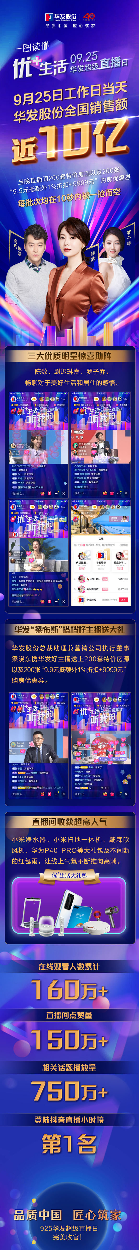 9月25日晚,華發(fā)股份抖音直播首秀--“華發(fā)超級直播日”拉開帷幕。這場由當紅明星、華發(fā)股份高管及普通員工跨界合作的超級“帶貨”直播活動,累計觀看量達160余萬人次。直播當晚約兩小時內(nèi),共分5批次推出的200套秒殺房源及200張“9.9元抵額外1%折扣+9999元”的購房優(yōu)惠券,每批次均在10秒內(nèi)被一搶而空。在話題的持續(xù)帶動下,25日工作日當天,華發(fā)股份全國共實現(xiàn)銷售額近10億元。