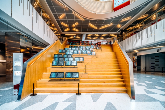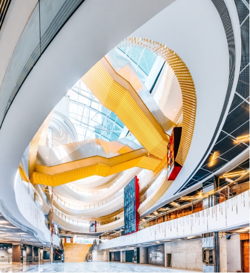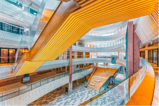 在挑空的中庭下,無(wú)邊界大樓梯、環(huán)繞觀景臺(tái),形成一個(gè)讓人流連忘返、集合交流、探索、藝術(shù)、互動(dòng)、共享等功能的綜合空間,消化商業(yè)與辦公共同的社交需求,成為生活與工作互為轉(zhuǎn)變的契機(jī) ,讓商業(yè)與辦公的過(guò)渡節(jié)奏自動(dòng)放緩,在項(xiàng)目?jī)?nèi)部就直接形成了“商辦共圈的內(nèi)循環(huán)”。