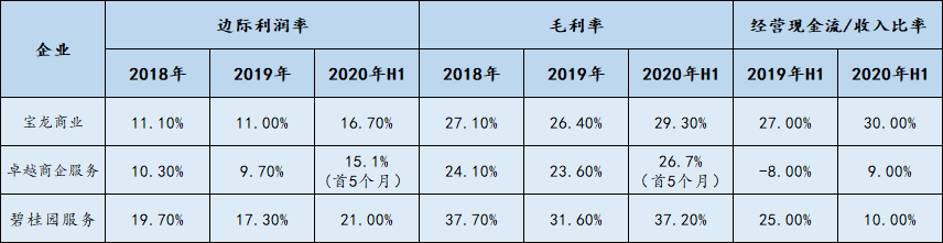 商業(yè)物業(yè)管理過去幾年的競爭十分激烈,比較寶龍商業(yè)、卓越商企服務(wù)及住宅物管龍頭碧桂園服務(wù)過去幾年的毛利和邊際利潤率可以看出跡象。