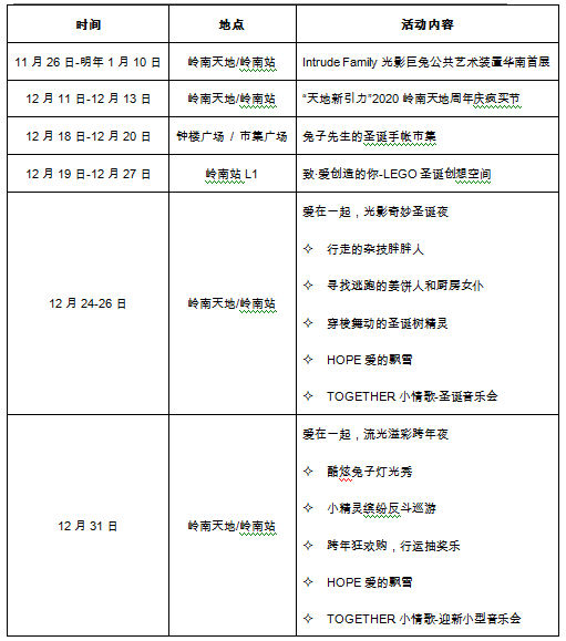 亮燈儀式當(dāng)天同步為嶺南天地“愛在一起HOPETOGETHER”光影藝術(shù)季拉開帷幕。即日起至12月期間,每逢周末及節(jié)假日嶺南天地將推出一系列節(jié)日氛圍濃厚的個(gè)性化演出及活動(dòng),包括行走的雜技胖胖人、舞動(dòng)的圣誕樹精靈、HOPE愛的飄雪,TOGETHER小情歌音樂演奏、兔子先生的手賬市集、流光溢彩跨年夜等。“致·愛創(chuàng)造的你”LEGO創(chuàng)想空間將閃現(xiàn)嶺南站,打造廣佛地區(qū)首棵由樂高拼砌的3米巨型圣誕樹。一系列精彩紛呈的線下文化及藝術(shù)活動(dòng)將為公眾構(gòu)筑一個(gè)帶有溫暖詩意的冬日出行社交目的地。