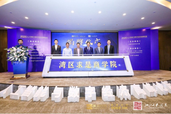 論壇活動現(xiàn)場,浙江大學(xué)·匯景人工智能與數(shù)字經(jīng)濟聯(lián)合研究中心的雙方代表上臺,共同為灣區(qū)求是商學(xué)院揭牌。
