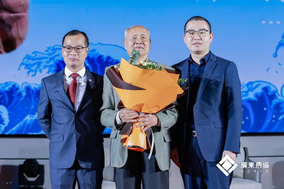 △廣東省房協(xié)會(huì)長(zhǎng)王韶(左)及“后浪”代表:佳兆業(yè)集團(tuán)副總裁、首席經(jīng)濟(jì)學(xué)家劉策(右)向駱錦星前輩(中)敬獻(xiàn)鮮花