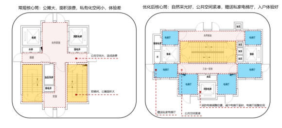 市面上盛行的傳統(tǒng)型核心筒樓宇建筑,但兩翼戶型可能有自遮擋情況、影響中間戶型的通風(fēng)采光。