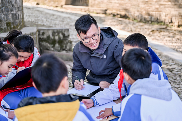 12月21日上午,大山環(huán)抱的連州市豐陽鎮(zhèn)中心學(xué)校附近,一群五年級(jí)的孩子們正在進(jìn)行一堂特別的美育融合課。
