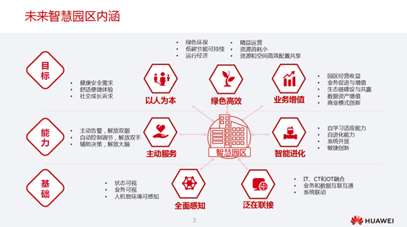 “全面感知”和“泛在聯(lián)接”,是智慧園區(qū)成為人機(jī)事物深度融合的基礎(chǔ);“主動(dòng)服務(wù)”、“智能進(jìn)化”,是智慧園區(qū)成為有機(jī)生命體所具有的能力;“以人為本,綠色高效,業(yè)務(wù)增值”,是智慧園區(qū)建設(shè)新時(shí)代城市經(jīng)濟(jì)核心載體的目標(biāo)。