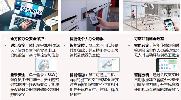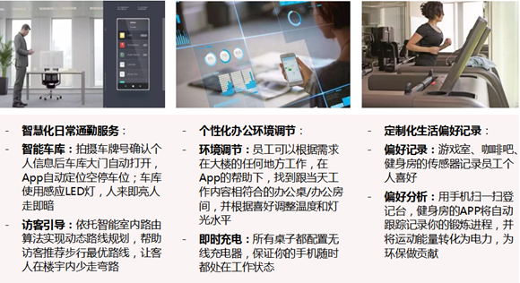 環(huán)境調(diào)節(jié):企業(yè)用戶可以根據(jù)需求在大樓的任何地方工作,依托手機(jī)app隨時(shí)找到工作內(nèi)容相符合的辦公桌/辦公房間,并根據(jù)喜好調(diào)整溫度和燈光水平;