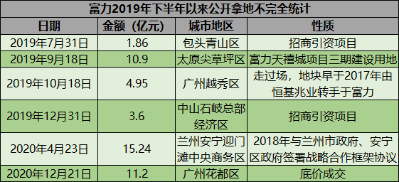 回顧富力2019年下半年以來的新增土地情況,據(jù)不完全統(tǒng)計,2019年下半年僅新增了286萬平方米土儲。