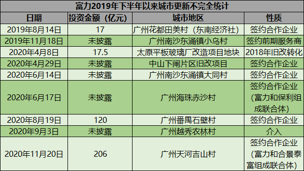 反觀城市更新方面,據(jù)不完全統(tǒng)計,富力2019年下半年至今有多達9條動態(tài),其中2020年就成功簽約中山下閘片區(qū)、廣州南沙大同村、廣州海珠赤沙村、廣州番禺石壁一二三四村以及廣州天河吉山村多個舊村改造項目。