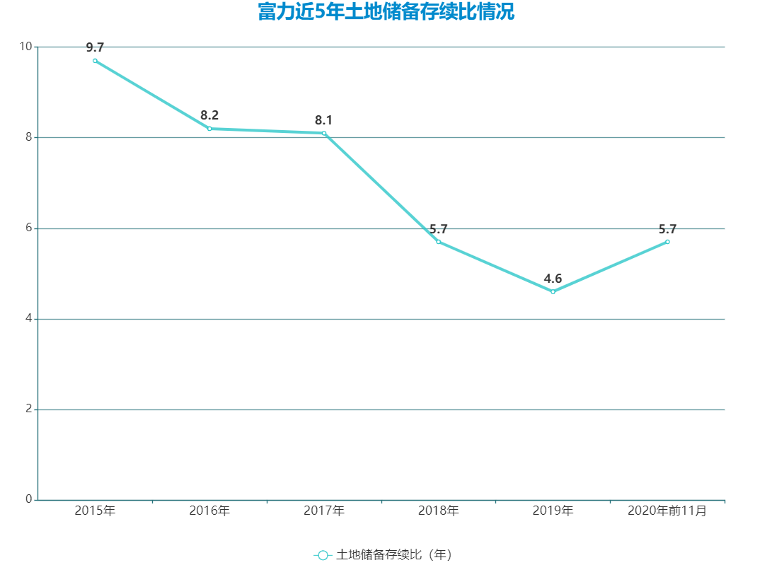 用最簡單的土地儲備存續(xù)比來看,富力2019年末土地儲備存續(xù)比表現(xiàn)為4.6年,處于3.75-5年的行業(yè)標準區(qū)間。截至2020年11月底,用半年度土儲數(shù)據(jù)計算,該數(shù)據(jù)則為5.74年。