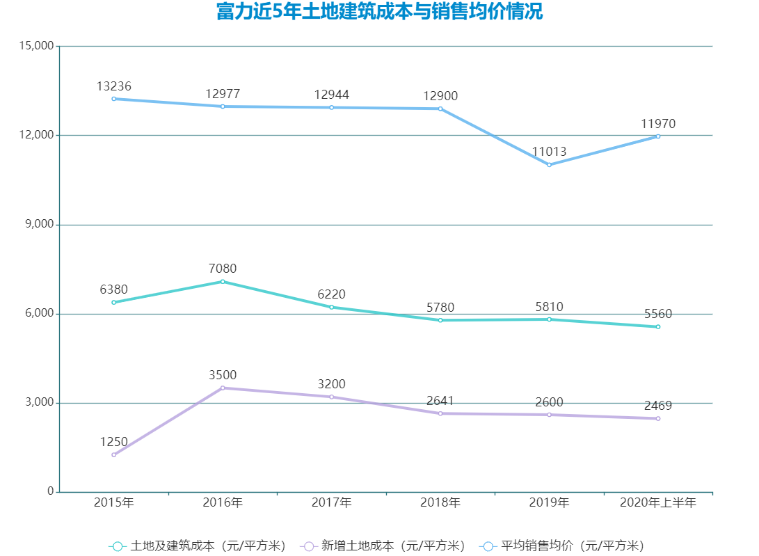 此外,2016年末富力土儲成本為1700元/平方米,2019年末才升至2600元/平方米。眾所周知,富力2020年在招拍掛方面并不活躍,半年新增243萬平方米土地,土地成本為2469元/平方米。