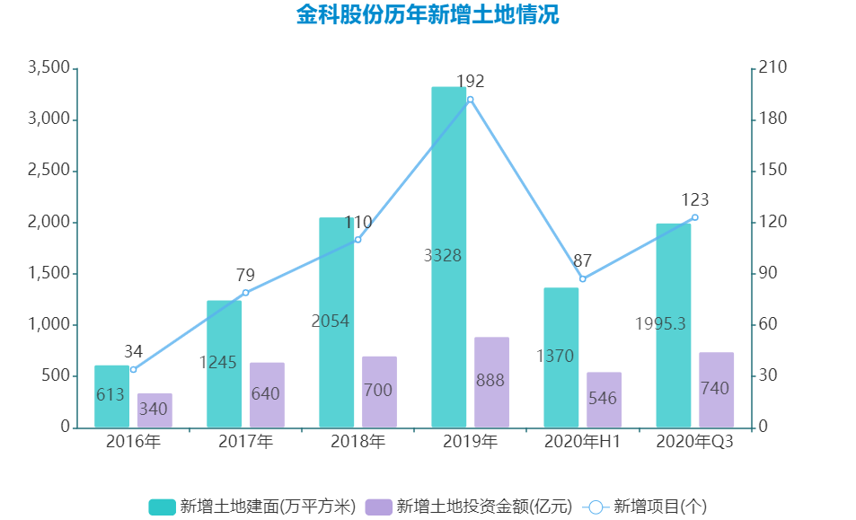 2020年前三季度,金科累計(jì)獲取項(xiàng)目123個(gè),新增計(jì)容建面1995.3萬平方米,同比下降18.4%,對(duì)應(yīng)拿地金額740億元,同比增長(zhǎng)20.6%。