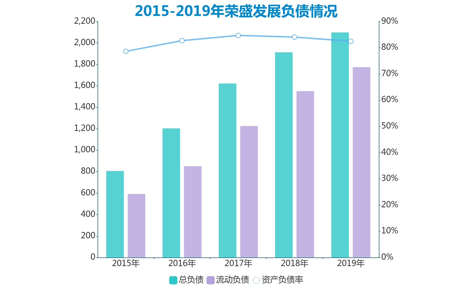 2015-2018年,榮盛發(fā)展投資活動現(xiàn)金流均為負(fù)數(shù),分別為-28.03億元、-27.37億元、-48.43億元、-29.68億元;資產(chǎn)負(fù)債率也由78.6%上漲至84.04%,總負(fù)債由808.59億元增至1914.02億元,其中流動負(fù)債由594.03億元翻了兩番至1552.54億元。