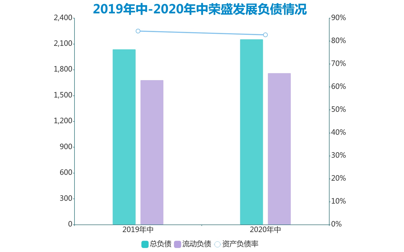 “三道紅線”出臺之前,榮盛發(fā)展債務(wù)水平仍有所提升,2020年中期,負(fù)債總額、資產(chǎn)負(fù)債率均有所微增,負(fù)債總額為2155.58億元,資產(chǎn)負(fù)債率為82.74%,有息借款總額亦增至707.86億元。