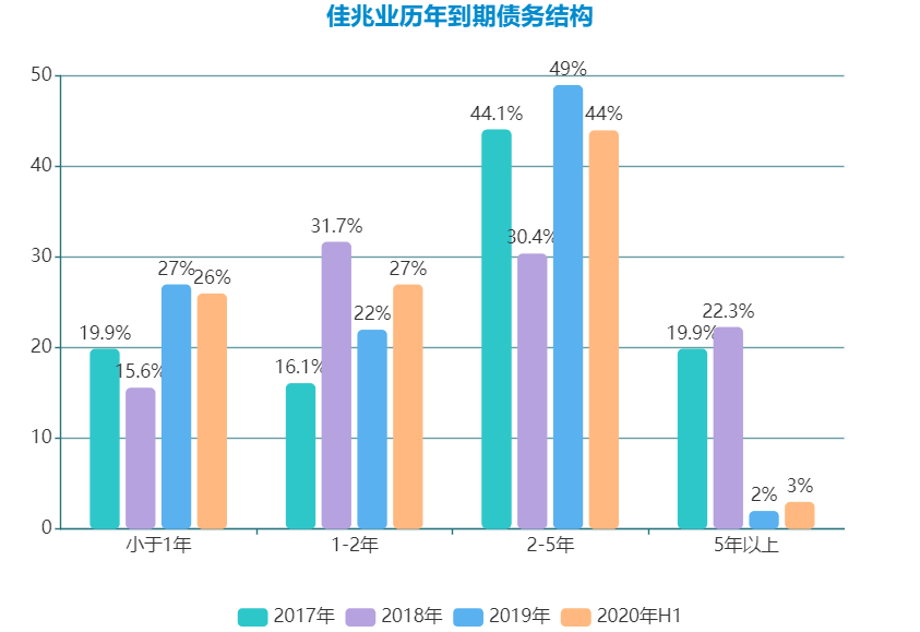 同時,佳兆業(yè)早前便已表示融資年限會盡量往長期借款的結(jié)構(gòu)調(diào)整。2017-2019年,長期債務(wù)占比維持在80%以上。截止2020年6月30日,佳兆業(yè)長期債務(wù)占比84%。