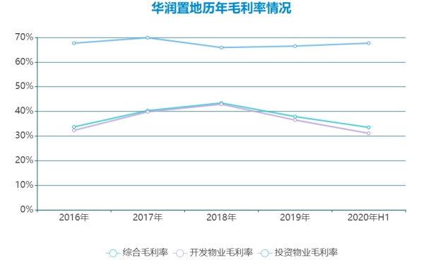從數(shù)據(jù)可窺見,華潤置地投資物業(yè)毛利率一直在65%以上,開發(fā)物業(yè)毛利率下探趨勢明顯。2020年上半年綜合毛利率為33.5%,較2019年末減少4.4個百分點,背后主因是開發(fā)業(yè)務毛利率下降導致。