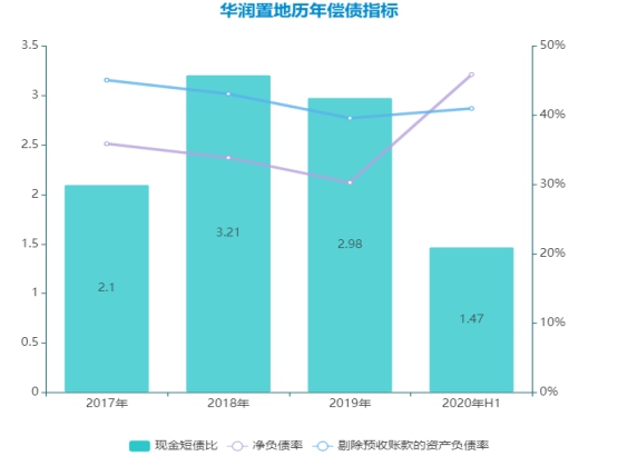 于2020年6月30日,華潤置地凈負債率45.9%,剔除預收賬款的資產(chǎn)負債率41%,現(xiàn)金短債比1.47。