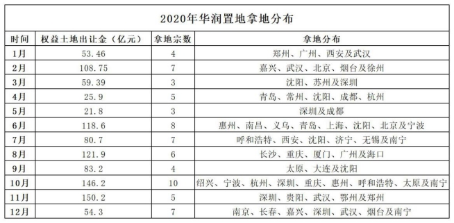 據(jù)不完全統(tǒng)計,華潤置地2020年新進入嘉興、義烏、濟寧、紹興4個城市,在一二線及強三線城市拿地占比達到90%。