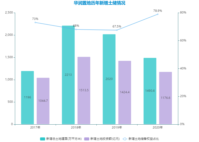 2020年,據(jù)觀點指數(shù)發(fā)布的1-12月中國房企新增土地儲備報告顯示,華潤置地全年新增土地儲備面積為1490.6萬平方米,新增權(quán)益面積為1176.6萬平方米,對應權(quán)益比例約為78.9%。