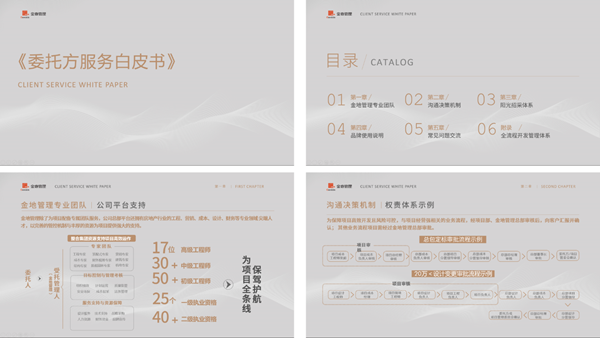 《委托方服務(wù)手冊(cè)》凝聚了金地管理公司全體員工的專業(yè)核心和心血付出,通過(guò)嚴(yán)謹(jǐn)?shù)捏w系架構(gòu)、標(biāo)準(zhǔn)的工作流程、清晰的案例呈現(xiàn),向委托方展現(xiàn)一個(gè)全方位的專業(yè)體系。手冊(cè)不僅展示了金地管理服務(wù)的意識(shí)和服務(wù)的專業(yè),也彰顯了金地管理在服務(wù)客戶和價(jià)值創(chuàng)造方面的決心和匠心。