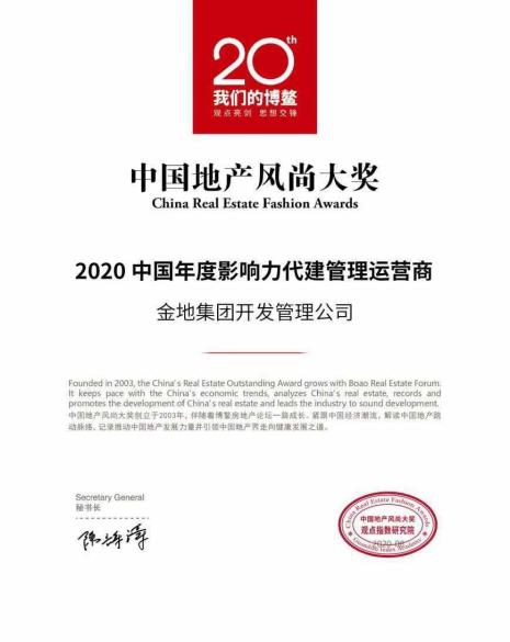 金地管理獲得“2020中國(guó)年度影響力代建管理運(yùn)營(yíng)商”等品牌榮譽(yù)