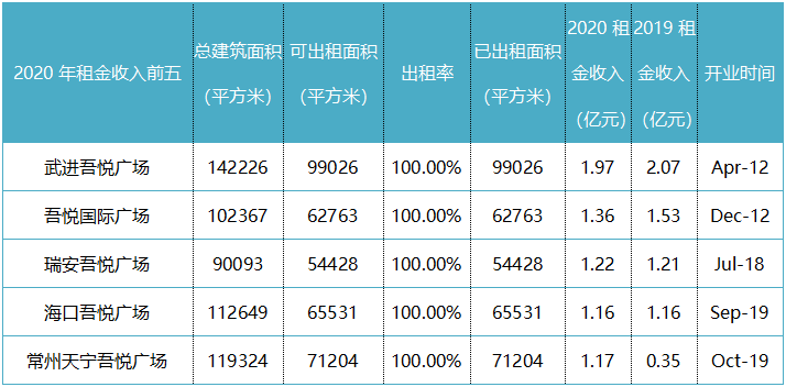 2020年租金收入前五的吾悅廣場