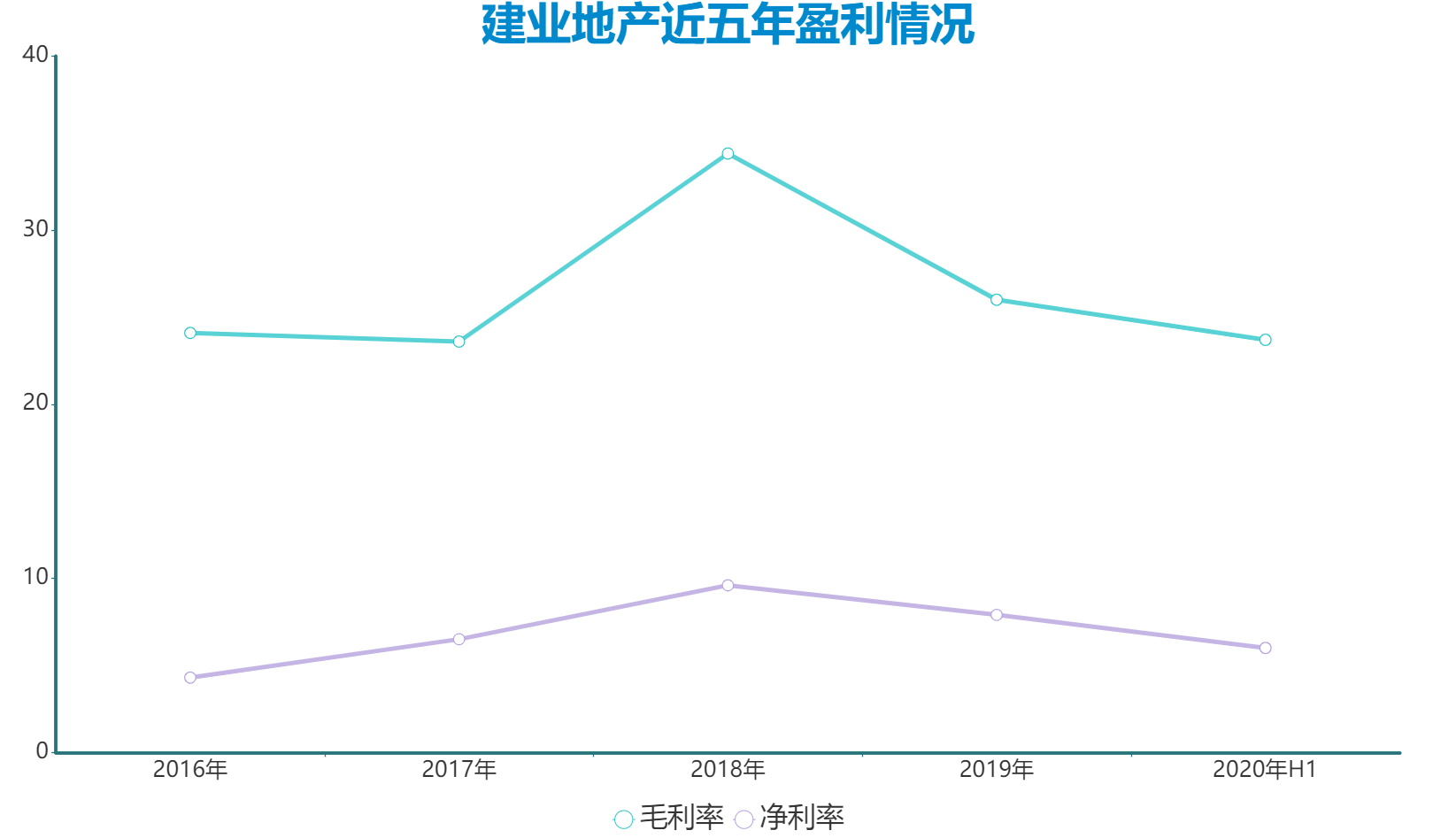 數(shù)據(jù)顯示,截至2020年中期,建業(yè)地產毛利率為23.73%,較2019年同期下跌3.6個百分點;凈利潤率為6.04%,同比下跌2.5個百分點。