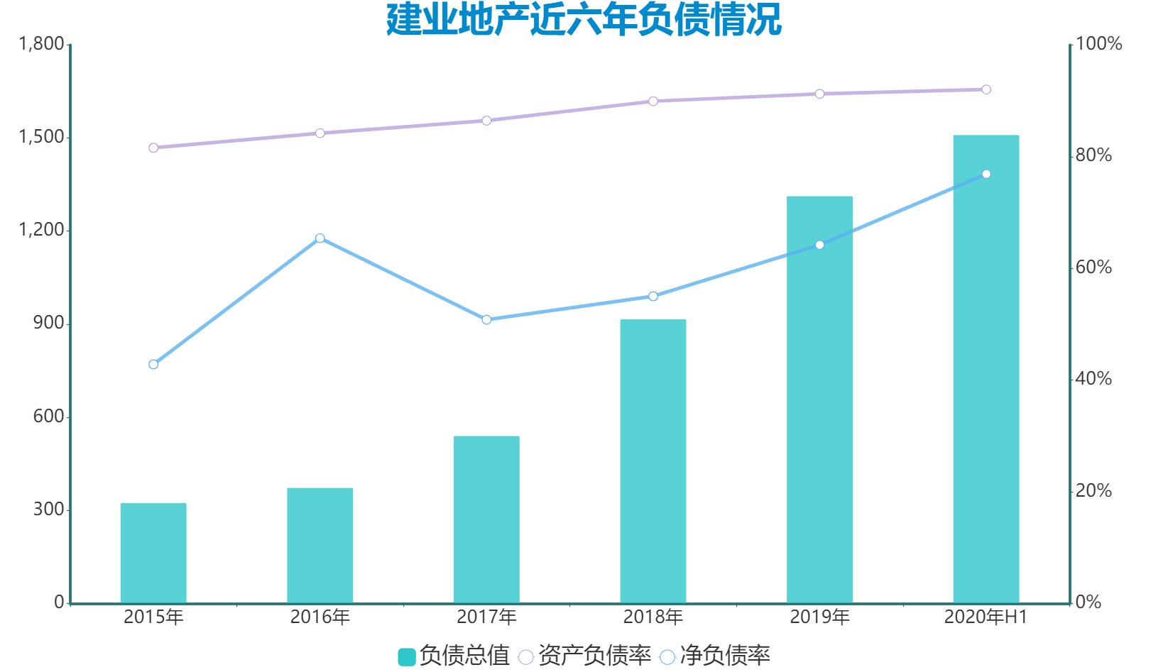 2020年上半年,建業(yè)地產錄得總資產1641.66億元,總負債為1510.78億元,資產負債率為92.03%,較2019年末的91.25%上升約0.78個百分點。此外,報告期內,建業(yè)地產凈負債率為76.9%,相比年初提高了12.7個百分點。