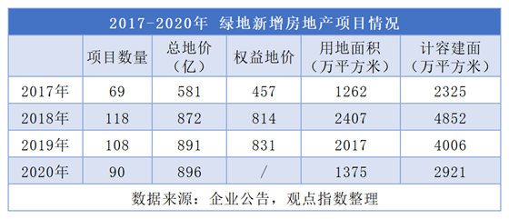 對比近三年新增房地產(chǎn)項目情況,2020年綠地新增土儲所涉及的總地價達(dá)到歷史最高值接近900億,新增計容建面較上一年度減少逾1000萬平方米至2921萬平方米,粗略計算拿地均價約3000元/平方米,同比增長約38%。