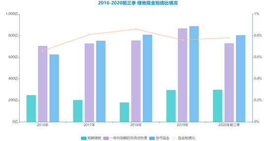 報表顯示的有息負(fù)債結(jié)構(gòu)看,雖然綠地去年三季度末短期債務(wù)和長期債務(wù)比例已調(diào)整為3比7,但短期借款依然占較大比重,貨幣現(xiàn)金增幅比不上短期債務(wù)增長,現(xiàn)金短債比常年小于1,短期償債壓力較大。
